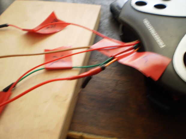 Soldar dos cables para el pulsador. El cable adicional de la palanca de mando de la tierra a un lado y el otro cable suelto al lado opuesto (diagonalmente opuestas, como hemos conectado antes). Este cable debe ser muy larga - del mismo tamaño que desee el cable entero de su controlador el cubo a ser.