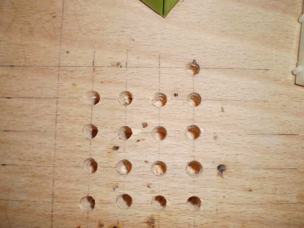Terminada estas líneas cuidadosamente perforar una (para mí 5mm) agujero en cada uno de los puntos de cruce de las líneas y el aparejo se acaba! Tenga en cuenta que su LED no debería ser capaz de moverse fácilmente después de pulsar en la plataforma, de lo contrario la soldadura será más difícil de realizar.