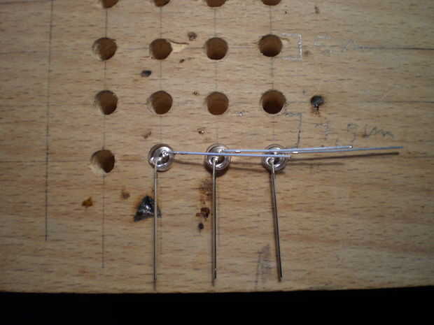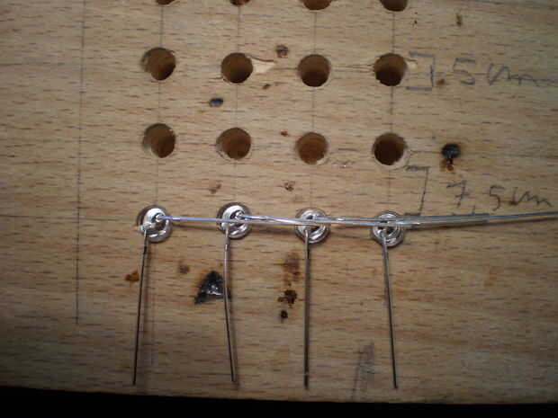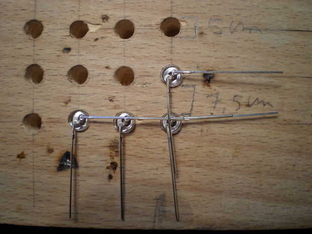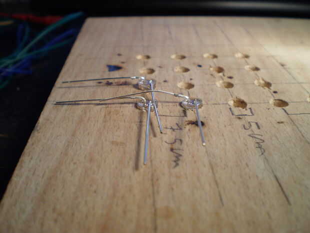 Después de la primera fila con la segunda fila (empezando por la derecha). Este tiempo debe tener en cuenta que la - pierna de la segunda fila de LEDs (los que deben mirar hacia abajo) tienen una pequeña torcedura en ellos: debe pasar sobre la horizontal + piernas de la primera fila y soldadas a la + pierna de la primera fila. Espero las fotos hará que sea más claro. Para asegurarse de que las piernas no son tocándote puede utilizar un destornillador o algo similar para hacer algo de espacio entre ellos.