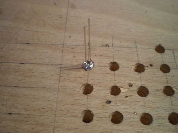 Después de haber doblado 16 LED, puede iniciar la soldadura de la esquina inferior derecha. No te olvides de cortar un trozo de la pierna cuando sea necesario (paso anterior). De esta manera usted tendrá los problemas menos colocando las piernas derecha. A partir de ahí primero completé la primera fila por soldar los tres LEDs de la fila inferior a él.