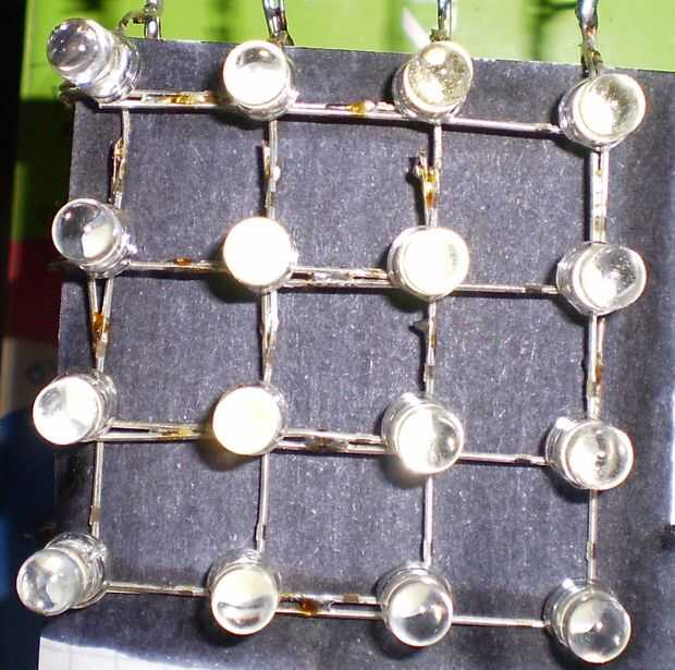 Si ha terminado las dos primeras filas, simplemente complete la fila tercera y cuarta del mismo modo. Siempre asegúrese de que ninguno de los + se toquen las piernas-piernas. De esta manera que usted debe terminar con un 4 x 4 multiplexado de matriz de LED. Esto significa que usted puede controlar todos los 16 LEDs individualmente con el uso de sólo 8 puertos en su Arduino.