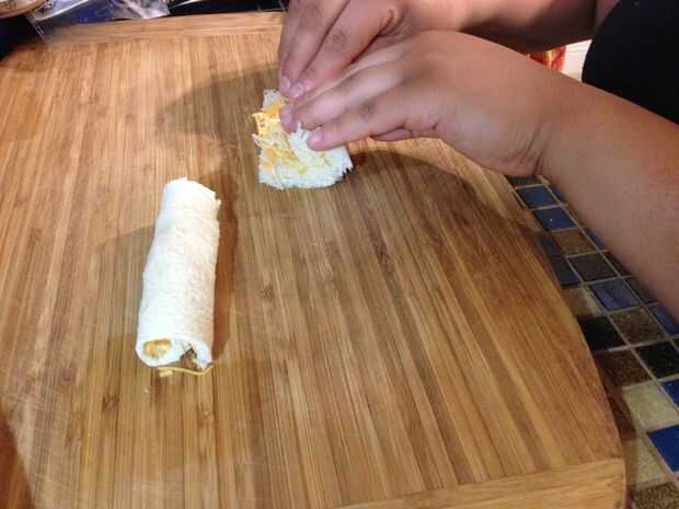 Del rodillo al final de un pan al otro con los dedos. Asegúrese de que en el queso como usted. Suavemente presione uniformemente para mantener en el queso y para obtener un cierre apretado en el rodillo. Lentamente comenzará a parecerse a un rollo de sushi.