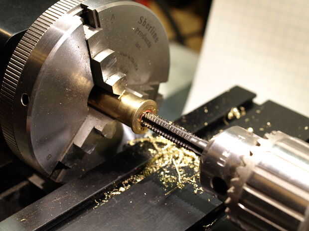 Después de completar el orificio utilizar el mandril montado stock de cola para asegurarse de que el grifo comienza recta. Luego retirar la carcasa y toque y completar el trabajo de golpear ligeramente con la mano. Encuentro que latón caso tiende al lado duro y recomiendo un buen lubricante para hacer el tapping. He encontrado a es a menudo ayuda a hacer el agujero un poco más grande que el tamaño del taladro grifo estándar. Con el 1/4 x 20 has ido tan grande como 7/32 y todavía tener suficiente hilo para sostener el perno.