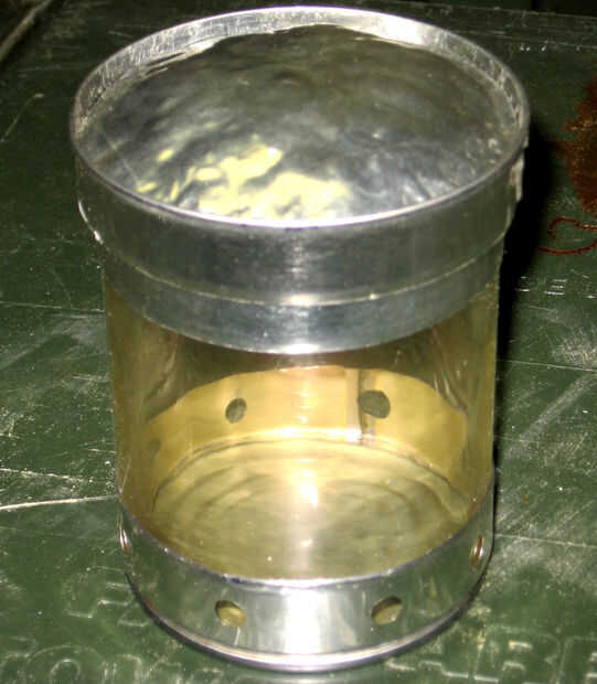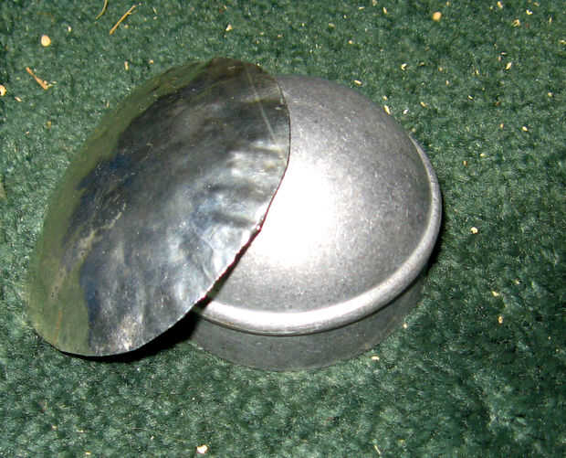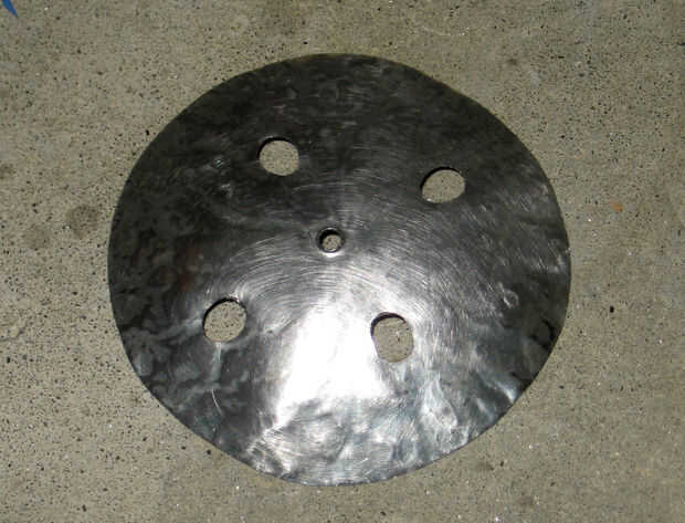 Un par de vueltas como esta y tenia... un cerebro. Al menos, parecía algo así como un cerebro. Recortar la parte sobrante y había archivado hasta que la pieza superior de la lámpara. Y... que todavía parecía un cerebro. Me di cuenta que iba a necesitar alguna forma de lo aplane. No tener una participación del aplanador, o cualquier cosa parecida a lo, decidí que sería ver si podía aproximar con un tope de poste de la cerca. Con mucho más ligeros golpecitos, que trabajado sistemáticamente alrededor de la pieza, descansando sobre la tapa del poste. El resultado fue algo mucho menos cerebro, que en realidad parecía (pensé) clase de fresco. Luego usar la perforadora de papel y presentó los agujeros con una lima redonda para alargarlos un poco. Yo entonces les había lijado suave.