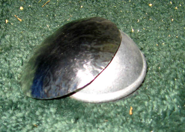 La técnica es mejor descrito muchos otros lugares, por gente que realmente sabe lo que están haciendo, pero aquí es la idea básica: iniciar en el centro de un círculo de metal y (suavemente) Pulse una vez la pieza con un martillo de bola. Gire un poco el metal y atacar el metal de nuevo, con una cantidad equivalente de la fuerza a la primera huelga. Mantener girando y pulsando, moviendo lentamente hacia fuera hacia el borde. El metal comenzará a leer y si seguir adelante, eventualmente asumirá la forma de un tazón de fuente, o si dan la vuelta, una cúpula. Si se trabaja el metal en una bóveda curva dramáticamente, probablemente necesitará calentar el metal hasta que brilla intensamente a templar (o relajar). De lo contrario, se convierte endurecida por el trabajo y será más apto para rasgar como diluye. Yo iba por una curva muy suave, por lo que no recocer la pieza.