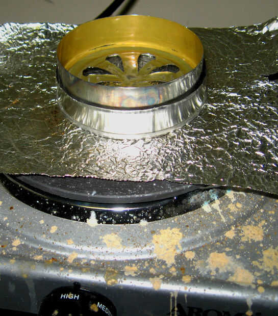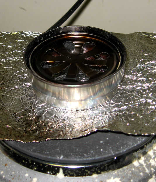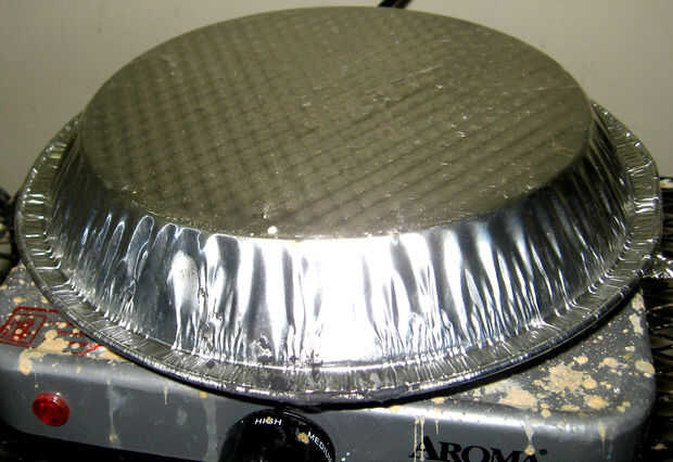 Porque soldadura fundida podría gotear por y, en general faltó su placa (obviamente que la nave ha dejado la estación en este caso), poner un trozo de aluminio (o aluminio, dependiendo de donde usted vive) papel debajo del conjunto. Para retener tanto calor como sea posible, he puesto una lata de pastel en la parte superior.