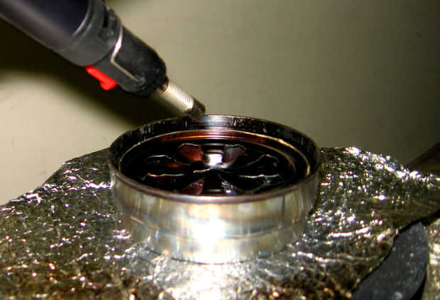 He utilizado soldadura metal general núcleo plomo ácido. Me imagino que electrónica (núcleo de fundente) soldadura tienden a reaccionar con el acero y hacer su vida miserable, sino que simplemente es una suposición. El metal real en la soldadura es la misma - sobre todo la lata con un poco de teeny de cobre. Debido al tamaño de la zona a soldar, el soldador no es probablemente el camino a seguir. Se puede utilizar un soplete de butano o propano (yo usé el primero para ayudar a calor el metal), pero en definitiva, me pareció poner el conjunto en un plato de caliente la opción más eficaz. Esto tiene la ventaja añadida de quemar cualquier resina o recubrimiento plástico de las piezas sin arena de las piezas.