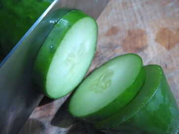 Cortar hasta cuatro cuartos de galón de pepinos medianos. No demasiado fina, sobre un cuarto pulgadas de espesor. He cortado los demasiado fina y, aunque eran buenos, se quedan mucho más crujientes cuando cortado grueso. También he utilizado realmente grandes pepinos, semillas, en rodajas y cortar en cuatro patas para las salmueras "final de la temporada".