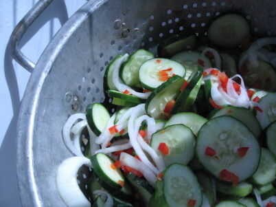 Después de las tres horas está para arriba, drenar su pepino en un colador grande. Escoger el hielo pero no enjuague.