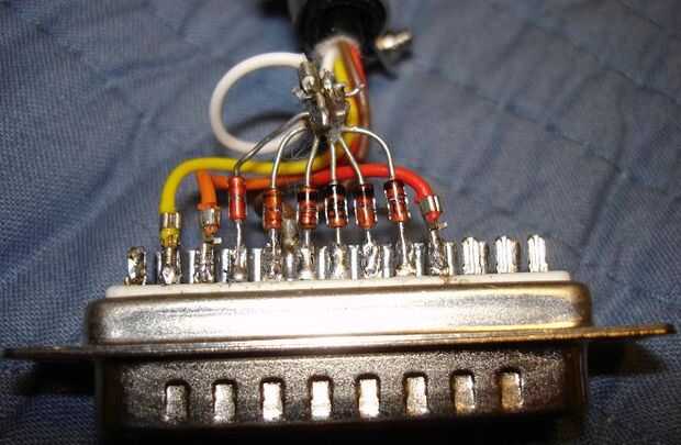 El cable amarillo/reloj se conecta al pin 2, el cable naranja/latch se conecta al pin 3, el cable de datos/rojo se conecta al pin 10 y el cable marrón de la tierra se conecta al pin 18 (si se alimenta a través del puerto paralelo).
