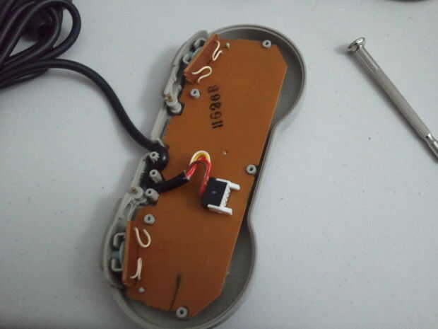 Retire los 5 tornillos de la parte posterior del controlador SNES y extraiga la parte posterior del controlador. Podemos ver la parte posterior de la placa y el conector del arnés del alambre. Quite el mazo de cables. Vamos a utilizar el mazo de cables para conectar el Teensy, así que ten cuidado al sacarlo.