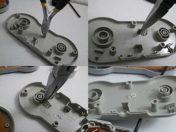 Necesitamos modificar el reverso de la caja de controlador SNES para hacer espacio para el Teensy. La foto muestra los 2 puntos que quitar. Primer clip de plástico, utilizar los alicates para pelar el plástico de la base. Cuando haya terminado, quisiera la foto de abajo a la derecha. El espacio libre que acabamos de crear es donde vamos a poner el Teensy.