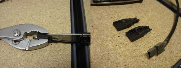 La cabeza de un cable USB es grasa. Necesitamos delgado por lo que cabe dentro de la caja del controlador SNES. Vamos a cortar la cubierta de goma alrededor del conector. Coloque el conector en su lado y sujetar con unos alicates. Siga el borde y cortar suavemente con una hoja para cada lado. ¡ ADVERTENCIA! NO PONGA LOS DEDOS CERCA DE LA CUCHILLA! Cuando haya terminado debe parecerse el lado derecho de la imagen. Envuelva el alambre que exponer con alguna cinta aislante.