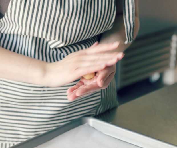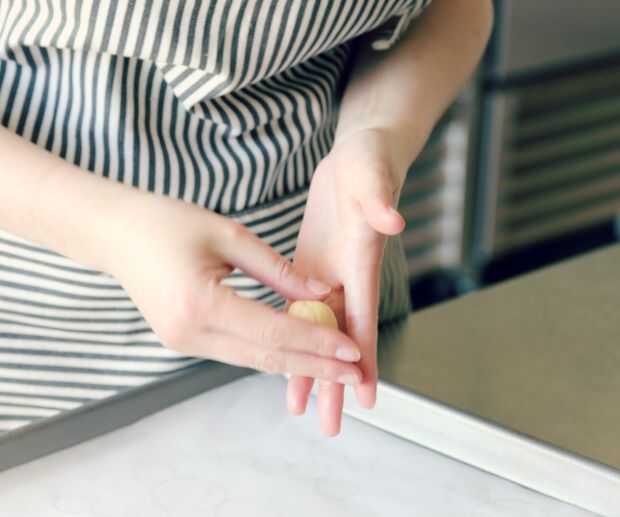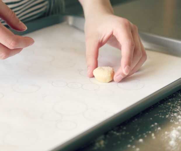 Hacer las bolas rodando pequeños trozos de masa entre las manos, comprobando los tamaños de la plantilla como vas. Una vez has alcanzado el tamaño adecuado, mojar sólo la parte superior de las bolas de azúcar y azúcar de lado bola de particular en la plantilla. Aplane cada uno un poco con la sanación de su mano. Las piezas deben ser aproximadamente 1/4" de espesor.