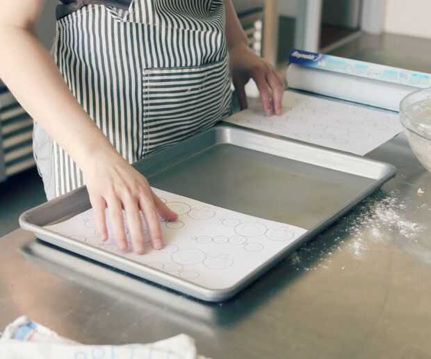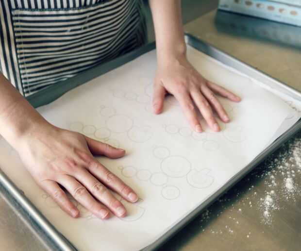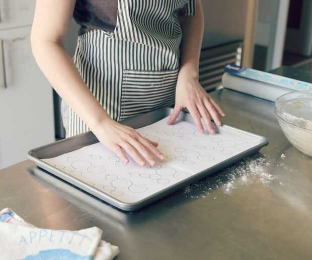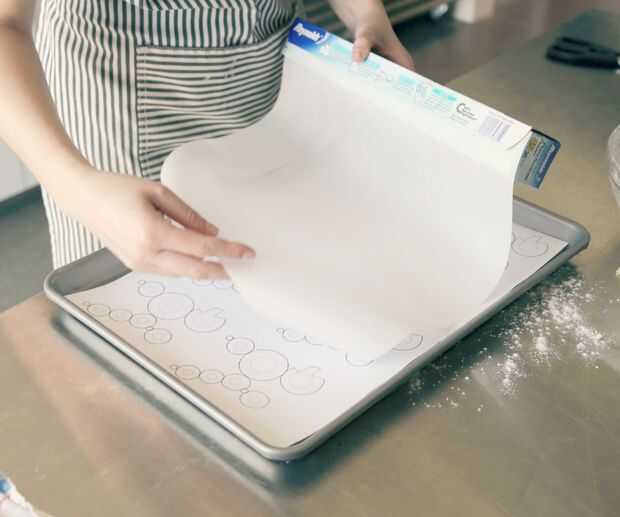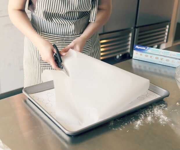 Corte un pedazo de papel pergamino para caber dentro de los bordes de las hojas para hornear.