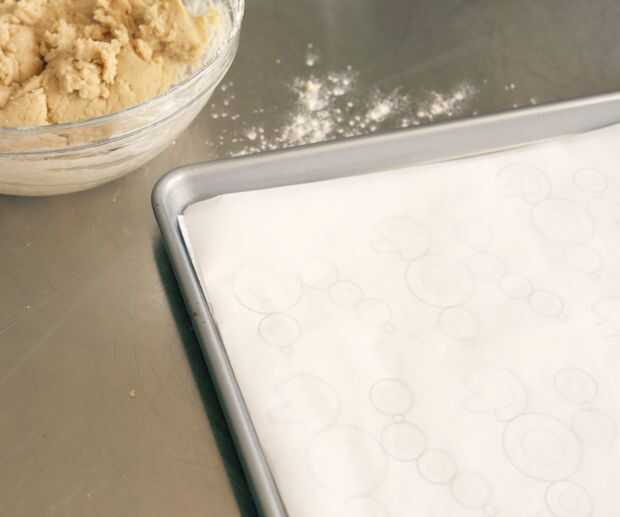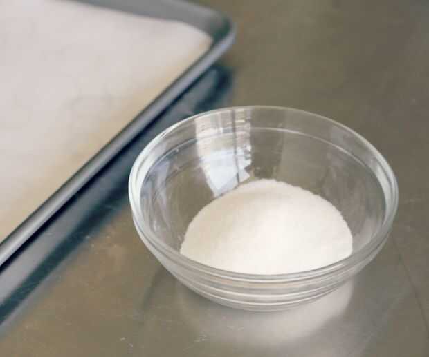 Configurar usted mismo con una bolita de masa que hace la línea de montaje. Coloque su tazón de pasta junto a una bandeja para hornear preparado y tiene un pequeño cuenco con el azúcar 1/4 de masa bola sumergir cerca.