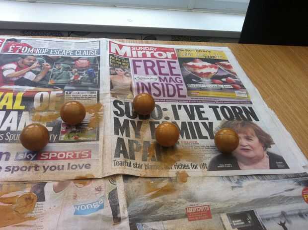 Lo primero que quieres hacer es pintar delicadamente su pelotita de ping pong, que necesita para obtener una buena capa uniforme. Recuerde poner periódico para lío poco como sea posible y asegúrese de usar guantes y abrir una ventana o puerta para ventilar. La pintura en aerosol no toma mucho en seco, así deja por aproximadamente una hora con una ventana o puerta abierta y colocada en el periódico.