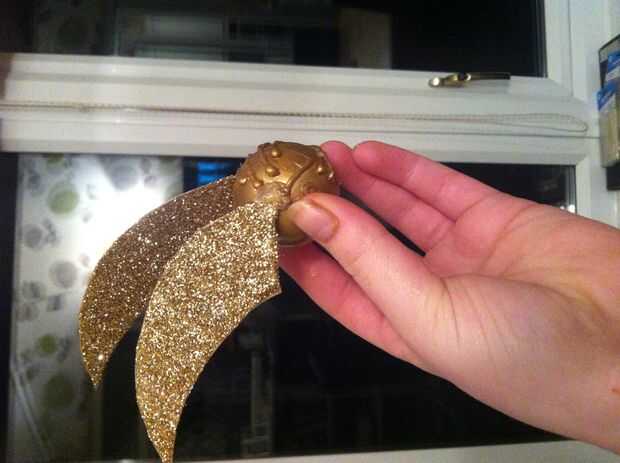 has siempre quería tener su propio snitch dorada? ¡ Pues ahora puede!Paso 1: Reunir suministros Para hacer el oro snitch necesitas:Oro lentejuelas (lotes)Una bola de espuma de poliestireno (no importa tamaño)Pins (lotes)Pegamento adhesivoPlumas de fa