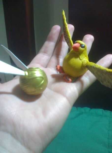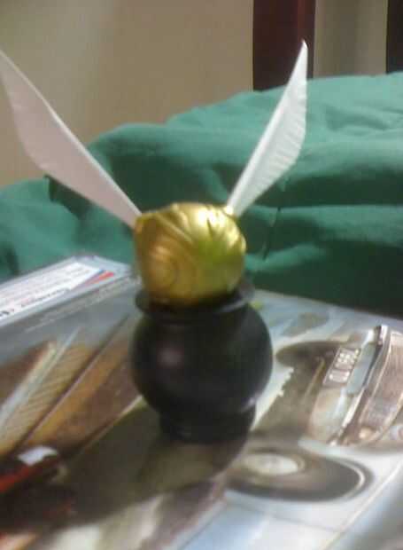 es una bola de poliestireno forrada en porcelana fría, plumas de papel y pintada con pintura de oro