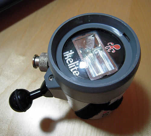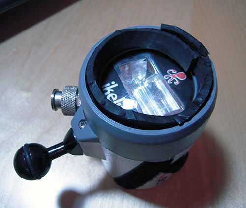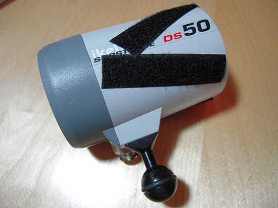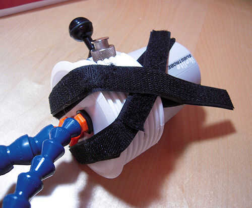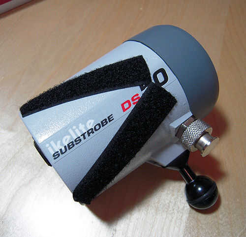 Ahora coloque el adaptador en el strobe y utilice las largas tiras de Velcro para sujetarla.
