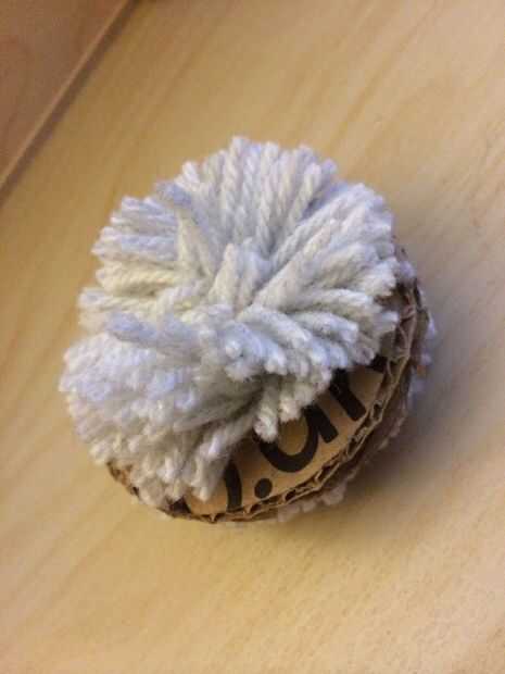 Ahora toma otro, menor, longitud del hilado y deslizarse entre los dos anillos. Hacer un par de nudos apretados, luego tire del cartón.