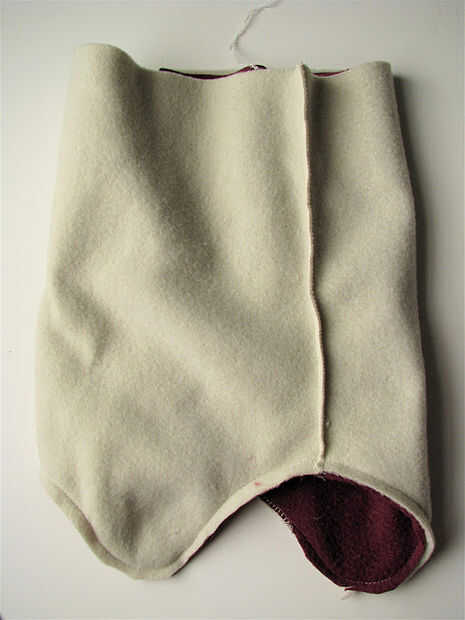 Opcional: en este punto usted puede también coser las cintas de una pareja si su hijo no mantener el sombrero a menos que esté atado. Sólo un par de 1-2 tiras de paño grueso y suave y emparedado entre las dos capas del sombrero con el extremo de la correa sobre la orejera.