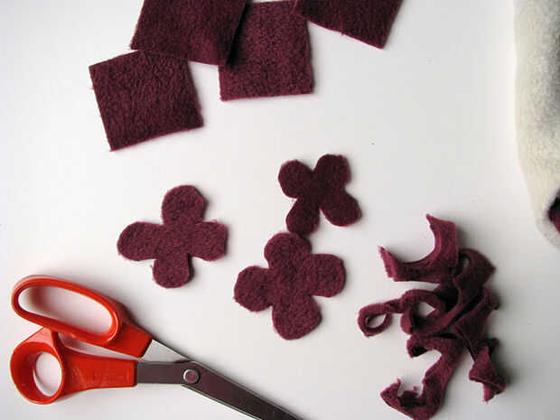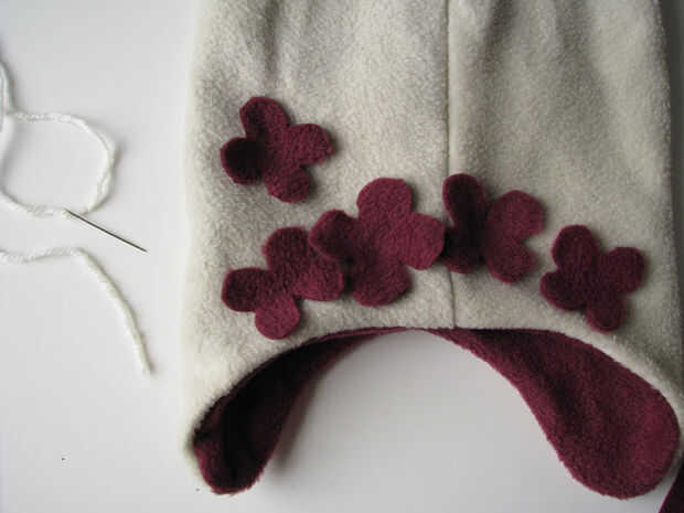 Cortar unas cuantas flores de 2 plazas de lana. Si quieres un look diferente podría también cortar lunares o coches o champiñones o lo que sea, o sólo deje apagado en conjunto.  Tenía originalmente la intención mano coser las flores en hilo, pero he encontrado que el tejido del lana era demasiado apretado para mi aguja pasar, así que terminé máquina costuras las flores con unas puntadas hacia adelante y hacia atrás en un patrón de X. Yo sólo coser a través de una capa de paño grueso y suave aquí así que no sería visible en el otro lado.  También se puede ver que tenía originalmente la intención de poner más flores en, pero después de coser en tres flores decidí que era suficiente.