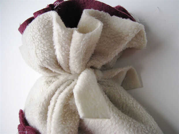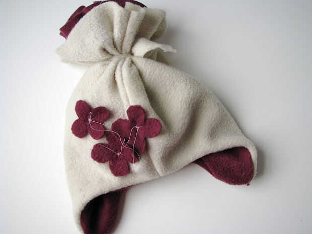 Corte una tira de 1 pulgada de paño grueso y suave y se usa para atar la parte superior de 3 pulgadas desde la parte superior.  Puede ayudar a probar el sombrero y ver donde será el mejor lugar para atarla.  La belleza aquí es que si el sombrero es demasiado grande puedes cincha inferior y recorte más en la parte superior.