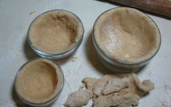 He desplegado la masa a 1/4", corta círculos para que coincida con tres pequeños tazones de fuente preparación de disminución de tamaño (3 1/2", 2 3/4", 2 1/4") y había forrado con la masa. El hecho de que los tazones de fuente no son completamente redondas en la parte inferior hacen de bolas de nieve super easy a la pila!