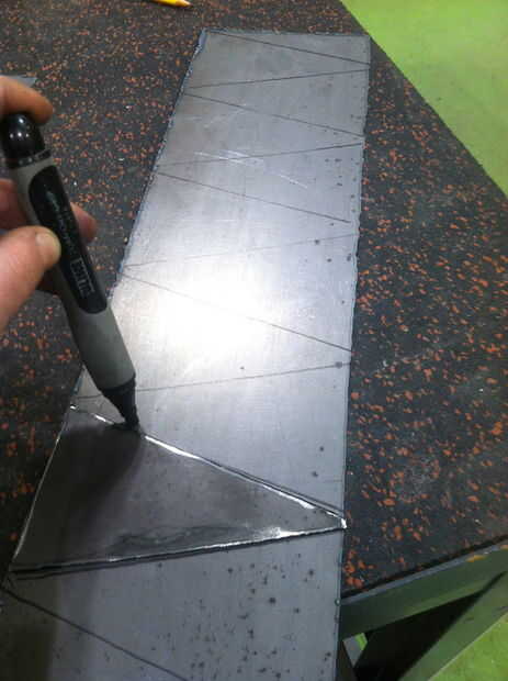 En total necesitarás 50 triángulos, pero siempre es bueno tener extra. Para este molde del tamaño llega a cerca de 3 pies cuadrados de acero y eligió un aspecto saludable cosecha de calibre 16.
