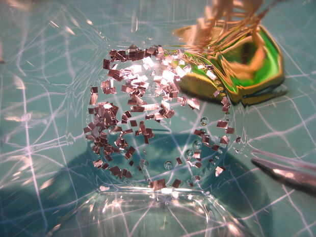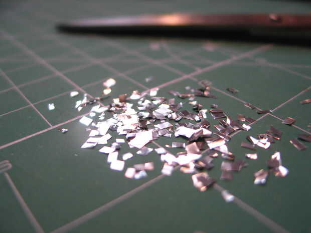Ok, ahora usted debe cortar unas pulgadas de papel de aluminio en 1/8 en o piezas cuadradas de 3mm para conseguir su brillo. Sólo cortar un manojo de tiras de una manera, entonces cortan a través, cucharada para arriba y colocarlos en su tarro de lujo.
