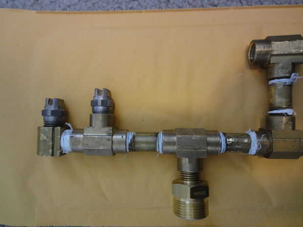 En los hilos abiertos del codo en el paso 5, conecte un segundo ¼ "X 1" niple y el segundo ¼" codo NPT hembra. Coloque las dos boquillas de MSM0204 a las roscas expuestas en la parte superior de la snowgun.