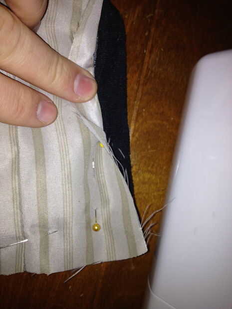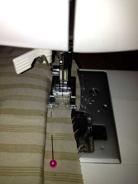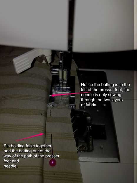 Cuando se utiliza la máquina de coser, quería crear un buen borde para coser. Para ello, tomé el corte de bordes, empujados el bateo de nuevo un poco (. 5" o algo así) desde el borde de la tela, entonces utiliza pernos para contener el bateo en lugar. Entonces yo sería coser una línea rápida para contener el bateo en el lugar y también me da un margen de costura a utilizar en el resto de mi construcción.