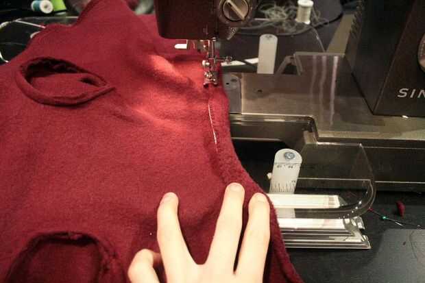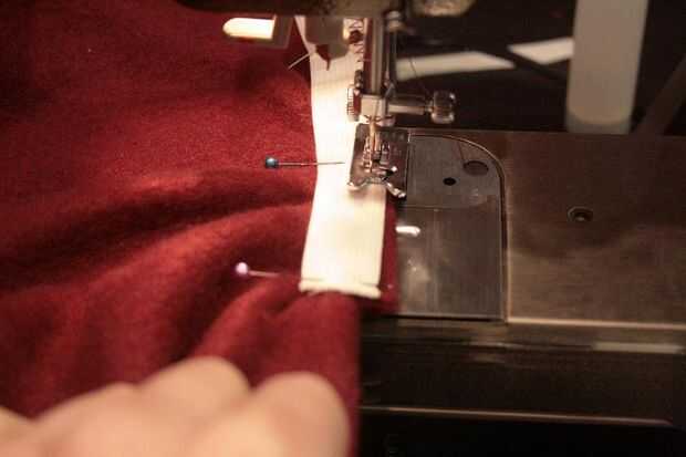 A continuación, doblar este borde de la tela, colocando el elástico entre el paño grueso y suave (ver Fig. 3). Puntada zigzag sobre este borde para crear el dobladillo de la snuggie.