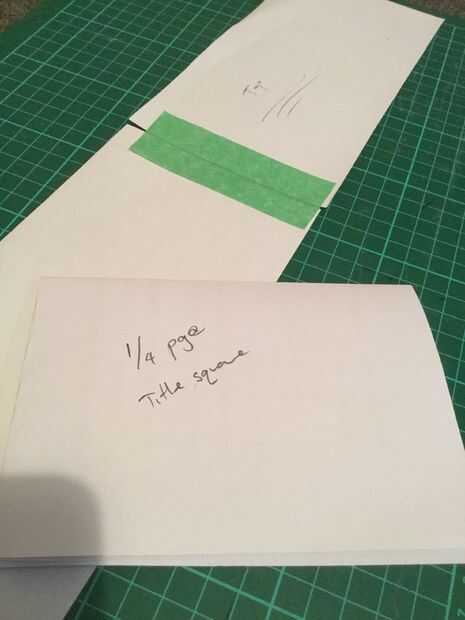 Toma otra hoja y dóblalo a la mitad y luego la mitad otra vez. Corte 1/4 de esta hoja a lo largo de las líneas de pliegue. Esta etiqueta como "título de frente".