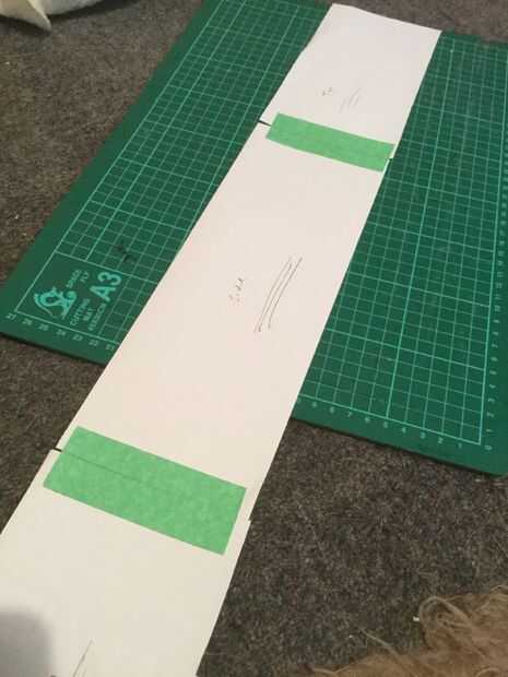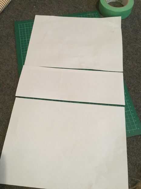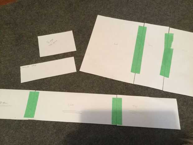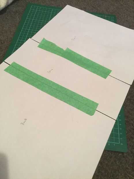 Toma otra hoja y doblar poco más de formas de anchura de terceras partes. Desea crear una franja que es el mismo ancho que la pieza de la espina dorsal, pero como muestra la imagen. Dos franjas de cinta este tamaño a la raya lateral corte... Y la etiqueta como superior, lateral e inferior. Dibujar unas líneas abajo la pieza como se muestra, esto le ayudará a esta pieza de patrón sobre la tela de rayas en la dirección correcta.