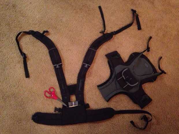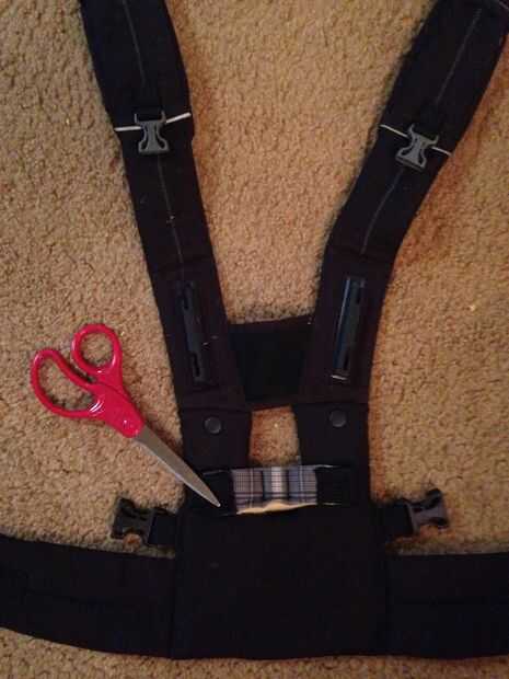 quité primero el cuerpo del portador original. Correspondiente a los lados (una característica en el Snugli original) y corte el asiento de la correa de cintura.