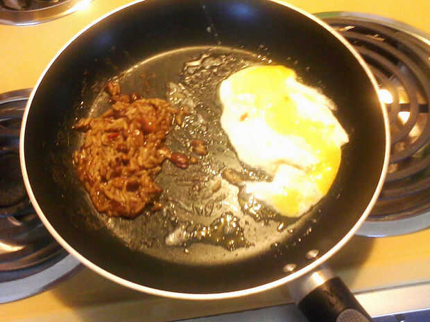 Romper un huevo en un lado y la freímos hasta.  Si se hacen los frijoles, dividir el calor del quemador para terminar su huevo.
