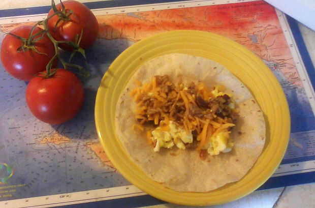 Añadir huevo, arroz y frijoles y queso en una tortilla.. .y