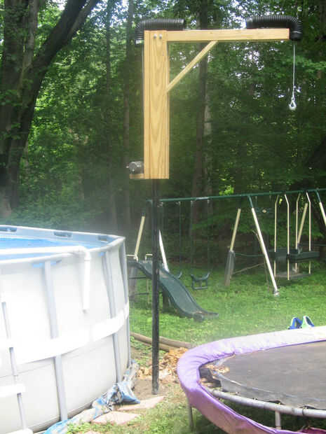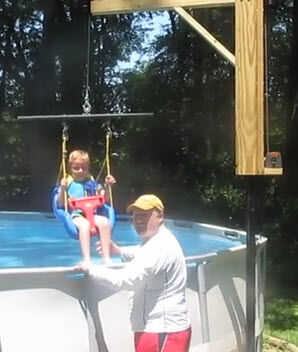 Yo busqué en Google por varios meses encontrar una elevación de piscina sobre tierra, pero sólo se encuentran en el suelo de la piscina ascensores. Sólo después construí esto encontré nada, pero incluso entonces eran más $4000 y no ir tan altos como éste. No tenía ni idea si esto realmente va a trabajar hasta después de lo construyó, pero funciona!!! Y por alrededor de $300. La idea es simple. Un poste es cementado en la tierra. Una grúa de madera fue construida para girar alrededor del poste. Luego se utilizó un cabrestante para subir y bajar una silla que puede girar sobre la piscina.
