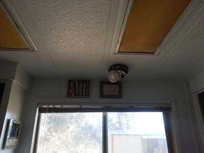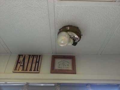 Así que quitar esta luz fea. (no el amarillo fluorescente que fueron substituidos en mi instructable) Iba a tener un agujero y un bonito círculo sucio y sin pintar. Me di cuenta que necesitaba un respaldo para estas luces. Madera vieja parece caliente ahora mismo, y aunque no fuera, ambos pensamos parece buena. Medí el área necesaria y me dirigí a la tienda.