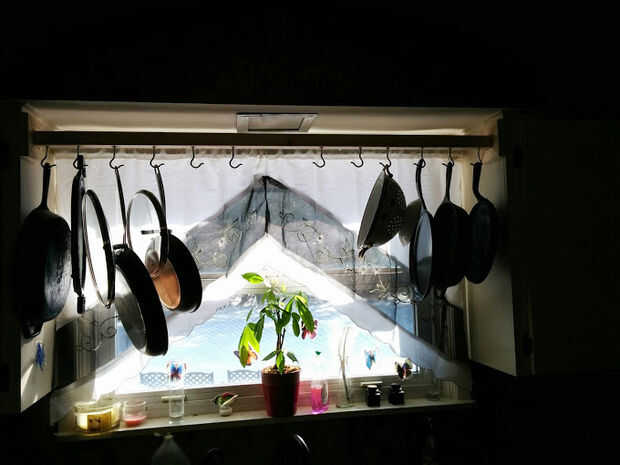 Quería un estante de arriba de la olla pero, no hay lugar para poner uno que tengo un ventilador de techo grande sobre mi mesa, en cualquier otro lugar, cabezas será golpeadas. Busqué en la red algo que pude cuelgue de mi fregadero fuera del camino. Todo lo que encontré no quería pagar. (barato) Lo dicho el infierno con él que voy a hacer mi propio!