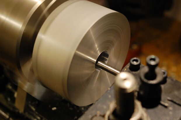poco. No conseguí una foto de la puesta a punto, pero lo hice con la apertura de las mordazas del mandril dentro del agujero para agarrar desde el interior. No estaba muy seguro sobre el terrón gran golpear de aliado está puesto mientras estaba presa, por lo que corrí que una longitud larga de pasadores a través de la contrapunta diámetro. Coloqué un metal barra de sujeción sobre el extremo de los pasadores y el extremo del aliado, luego nutted los pasadores en ambos extremos. Esto tira al aliado hacia el mandril y aseguró no iba a cualquier lugar (yo usé un método similar más tarde montar el aliado en el crosslide). Para asegurarse de que no marque la superficie del aliado, le puse unas hojas de papel entre ésta y la abrazadera.