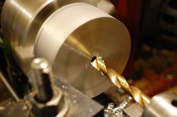 A continuación fue perforado un agujero piloto a través del centro. Empecé con un taladro de centro seguido de un 3mm, luego trabajado hasta mi taladro más grande, un 3/4".