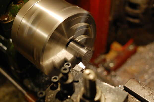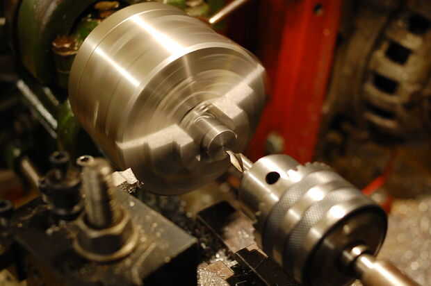 El "hub" entonces fue aserrado a la longitud y el extremo aserrado que se enfrentaron en el torno: