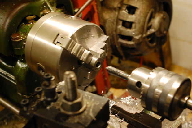 Cuando estoy golpeando o usando un troquel en el torno, uso un eje conducción mango a gire el portabrocas. Mi mango fue construido a partir de un kit de Hemingway, y encuentro que es roscado en el torno mucho más fácil.