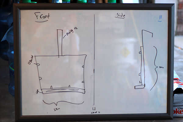 Luego tienes que decidir donde poner los soportes. Puse un 8 pulgadas por lado y dos en la parte inferior, cada 5 pulgadas desde el centro. Utilice su plaza para alinearlos y marcar dos agujeros de tornillo para cada uno.
