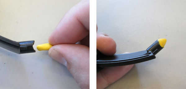 Limpie el cilindro de plástico con alcohol isopropílico. Luego lave y seque sus manos. Con las manos limpias, tomar un pequeño pedazo de sugru y trabajar entre sus dedos. Finalmente hacer un pequeño cilindro que se ajusta dentro del cilindro plástico. Empuje ese cilindro amarillo dentro de la plástica y dejó el desbordamiento sobresalen de la parte superior.