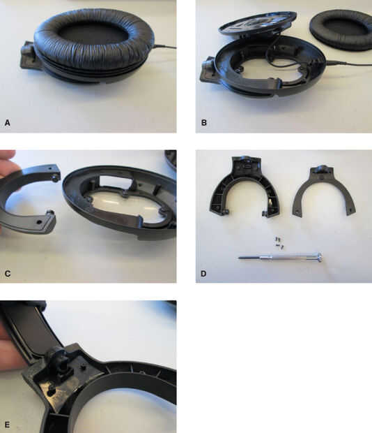 Ahora mueva hacia atrás a la pieza de oído (A). Quitar el amortiguador, sólo se remueve. Desenroscar el altavoz de la caja de plástico (B). A continuación, quite la pieza de plástico oscilante; con poca fuerza, se encaja a presión fuera de la pista (C). Encontrar los cuatro tornillos en la horquilla, eliminarlos y luego separar las dos placas (D). Llamaremos a éstos la placa trasera del brazo y la placa delantera, respectivamente como ponen de izquierda a derecha. Las placas de dos muelles (D) que se hace referencia a menudo en este instructable. El cilindro de la cabeza encaja en el orificio de la placa oscilante (E). Más tarde, regresaremos a la placa frontal.