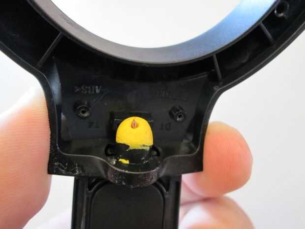 Inserte el cilindro de cabeza en el agujero de obús. Usted notará la punta del cable asomando fuera de la masa amarilla. Como avanzar y esculpir la masa amarilla, no podremos sacar el cilindro de la venda de la placa posterior del wishbone.